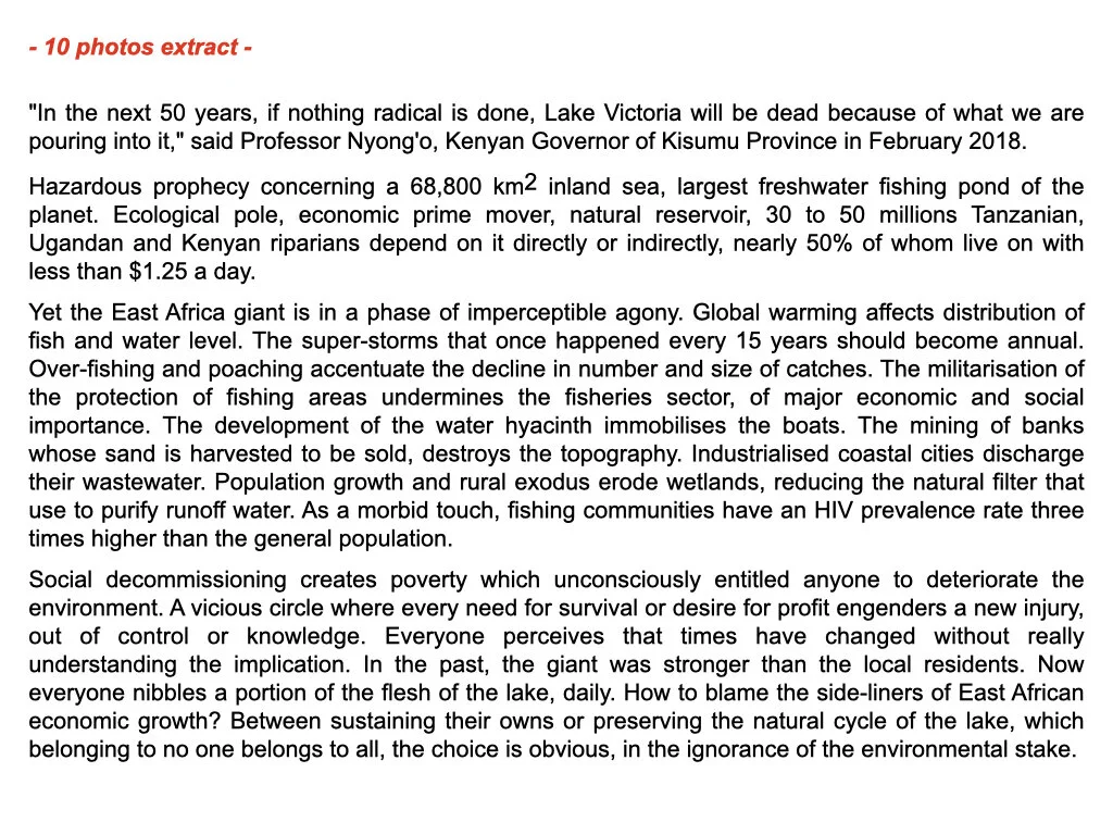 Murchison Bay, Kampala, Uganda - At a stone's throw from the Ugandan capital, an illegal fisherman refloat his boat, which he hides under trees all day long, in water made opaque by seaweed. Mixed patrols composed of soldiers and fishermen regularly pass nearby without having yet detected his little scheme. He is about to go fishing with a colleague along the shore with a small mesh net prohibited because it allows to catch fish smaller than allowed by law. On his return, he will sink his boat again.